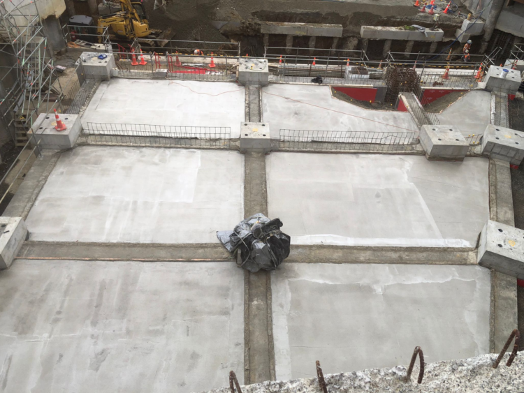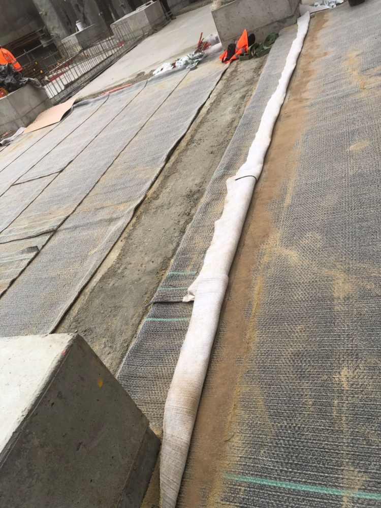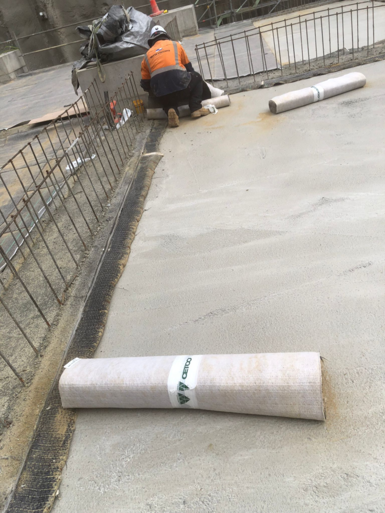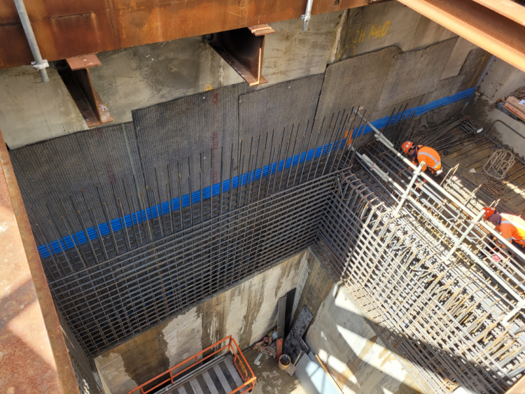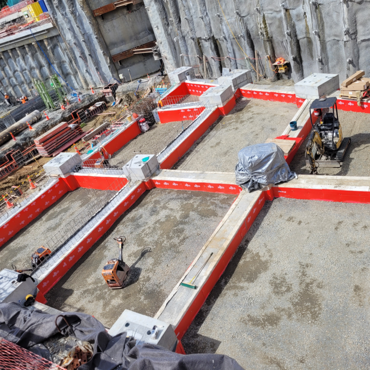 Service Tunnel: Voltex DS was installed under the slab and extended up the walls, including a centre guard detail along the wall line. Waterstop RX was applied to pile caps, with full sidewall and roof waterproofing completed as part of the system build-up.