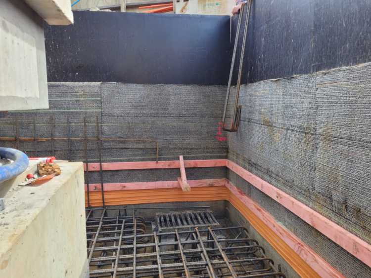 Basement: Ground beams were waterproofed with Volclay Voltex at the base, with Waterstop RX installed at pile caps and Volclay Swelltite post-applied to vertical faces. The underslab and rattle slab were fully tanked using Swelltite and Voltex, with Waterstop RX installed at all cold joints, including beams and penetrations.